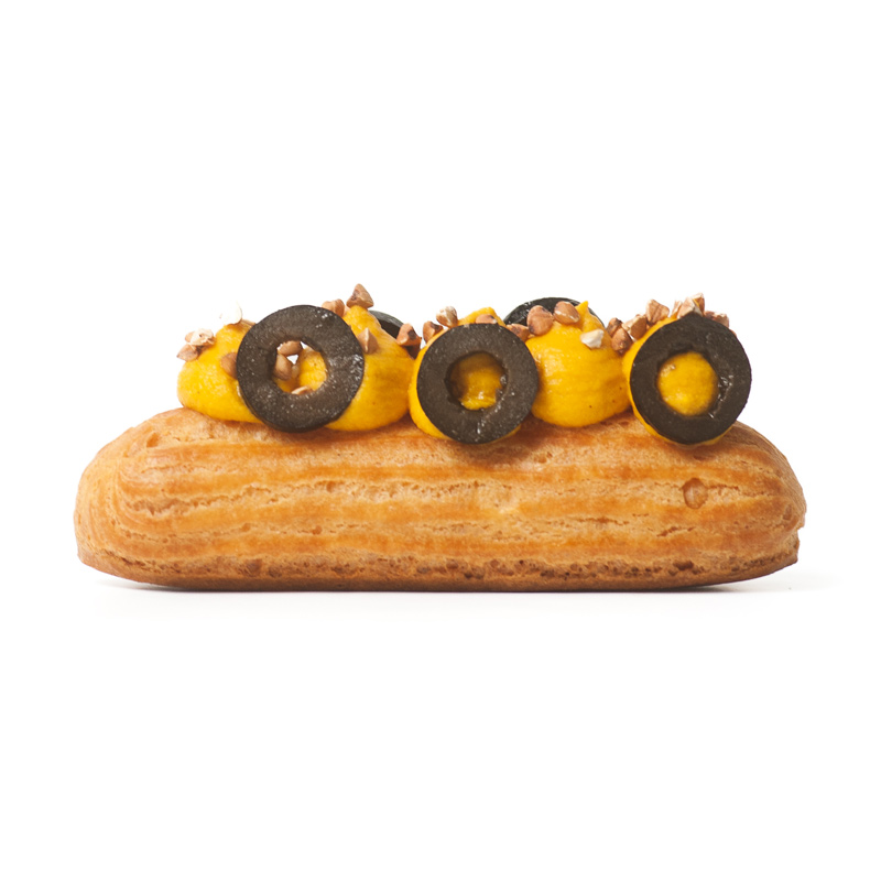 Houmous de carotte, curry, olives noires et graines de sarrasin.