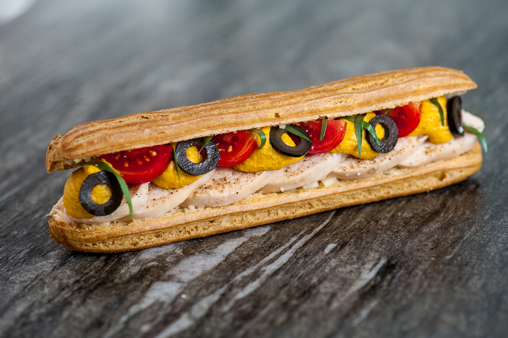 Poulet suisse cuit par nos soins, houmous de carotte et curry, colrave, estragon et tomates cerise.